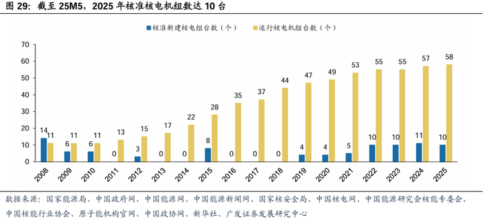国内核电机组进入高速发展期,核准建设提速。当前看,2011年福岛核事故后,核电安全性倍受重视,我国核电项目审批陷入停滞期,2011-2018年8年间仅核准11台。自2019年以来,每年核准核电机组数量呈现上升趋势。2024年,全国核准核电机组数达11台。截至25M5,2025年核准核电机组数达10台。预期看,根据中国核电发展中心、国网能源研究院发布的《我国核电发展规划研究》,预计2030年、2035年核电发展规模达131、169GW,发电量占比达到10.0%、13.5%。