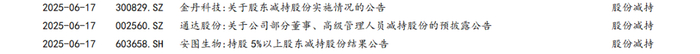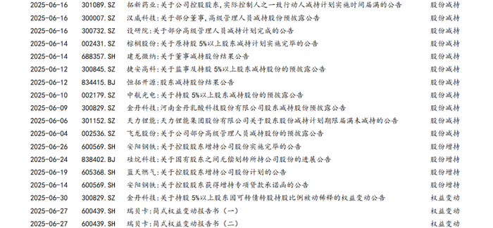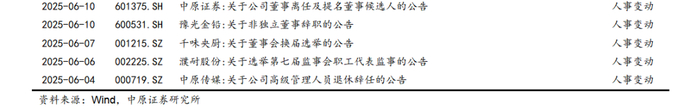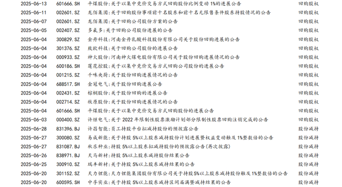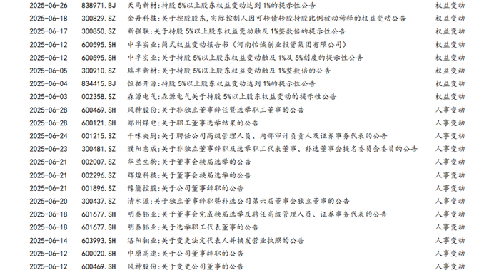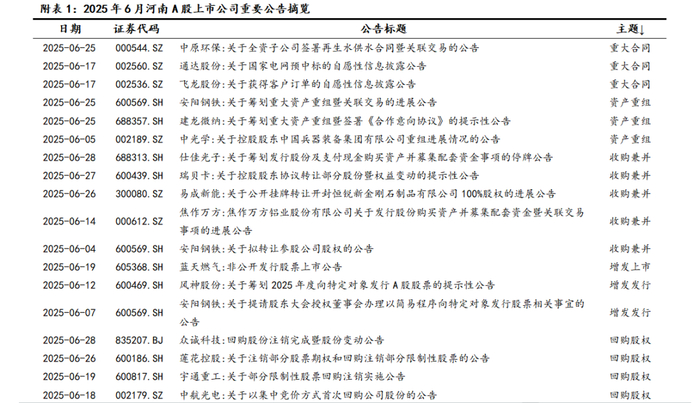 2025年6月份,河南上公司公告可重点关注重组和回购、股份减持以及人事变动等事项。例如:仕佳光子、建龙微纳等公司筹划资产重组公告,龙佰集团、平煤股份等公司回购公告,许昌智能、秋乐种业、通达股份、中航光电、金丹科技、飞龙股份等公司股东减持预披露公告,以及华兰生物、辉煌科技、千味央厨等公司董事会换届公告。详见“附表1:2025年6月份河南A股上市公司重点公告一览表”。