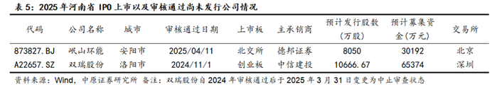 截至6月底,河南省IPO审核通过尚待发行公司1家,为拟在北交所上市的岷山环能。
