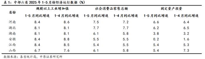 2025年1-5月份,中部各省经济运行略有承压,主要经济指标增速均有放缓。其中六省工业生产仍普遍维持高位,社会消费平稳增长,投资力度较为疲弱。相比较而言,河南省经济增长内生动力彰显优势。