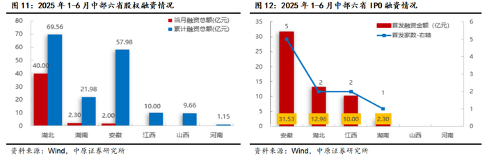 对比中部六省股权融资规模和数量,6月份,湖北、安徽和湖南三省均有1家公司增发或IPO上市,分别融资40亿元、2亿元和2.03亿元。1-6月份,湖北有5家公司融资69.56亿元,规模居六省第一;安徽有8家公司合计融资57.98亿元,居六省第二,其中有5单IPO,IPO数量居中部六省第一;湖南1单IPO、2单增发,融资规模居六省第三;江西实现2单IPO,融资规模居中部六省第四;山西、河南分别有1家公司增发实现融资。