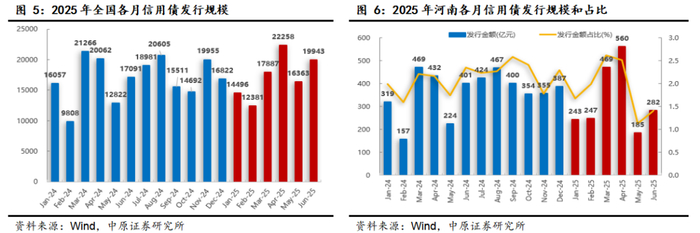 6月份,河南信用债券融资规模触底回升。Wind数据显示,6月份,河南省发行信用债发行51只,融资规模281.92亿元,环比增长52.54%;前6个月,累计发行338只信用债,融资规模1985.66亿元,同比由增转降,降幅0.80%,全国排名较前5个月又下降1位、至第12位,中部六省被安徽超越而降至第3位。