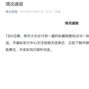 7月7日,安徽淮北市福利彩票发行中心发布情况通报: