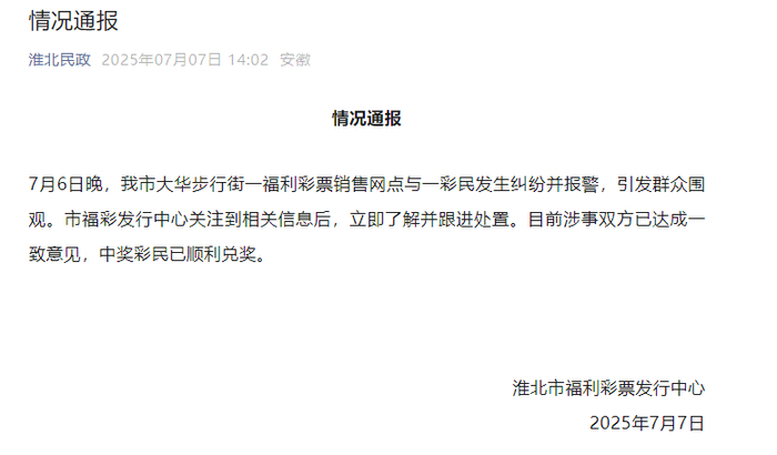 7月6日晚,我市大华步行街一福利彩票销售网点与一彩民发生纠纷并报警,引发群众围观。市福彩发行中心关注到相关信息后,立即了解并跟进处置。目前涉事双方已达成一致意见,中奖彩民已顺利兑奖。