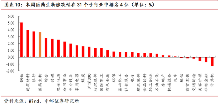 3.1 本周医药生物上涨3.64%,其他生物制品涨幅最大