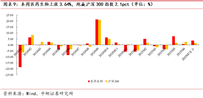 本周医药生物上涨3.64%,跑赢沪深300指数2.1pct,在31个子行业中排名第4位。 2025年7月至今医药生物上涨3.64%,跑赢沪深300指数1.54pct。
