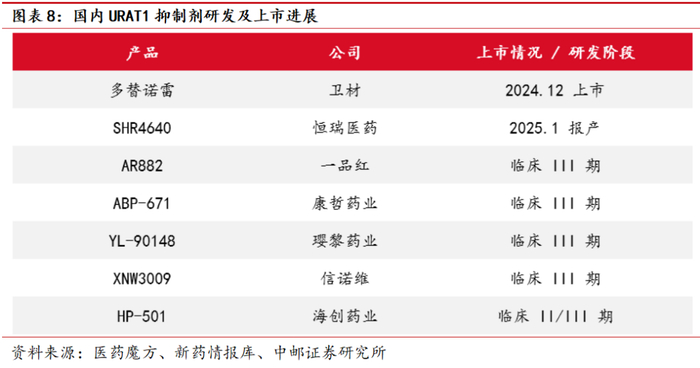 目前我国高尿酸/痛风领域在研药物靶点主要包括URAT1、Uric acid、XO、IL-1β,其中URAT1抑制剂在研产品数量最多。URAT1负责将尿酸盐从尿液中重吸收到近曲小管细胞,URAT1 抑制剂可以通过抑制尿酸盐的重吸收,从而促进尿酸从体内的排泄并降低血尿酸水平。2024 年 12 月,多替诺雷在中国批准上市,适应症为痛风伴高尿酸血症。在研产品中进度最快的为恒瑞医药SHR4640上市申请获受理。