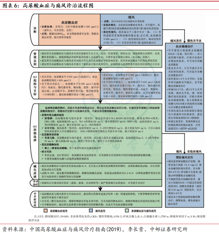 痛风可分为4期:(1)无症状HUA期;(2)痛风性关节炎急性发作期;(3)痛风性关节炎发作间歇期;(4)慢性痛风性关节炎期。急性发作期往往伴随剧痛且持续时间较长,主要原因是尿酸盐结晶沉积在关节及周围软组织引发炎症反应,常见治疗药物包非甾体抗炎药(NSAIDs)、秋水仙碱和糖皮质激素。整体来看,痛风领域药品种类较少且缺乏新机制药物,存在巨大未满足临床需求。