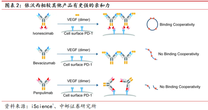 以康方生物依沃西为例,它是一种四价双特异性抗体,能够同时靶向PD-1和VEGF两个关键靶点。通过对Fc进行工程改造,依沃西减少了Fc介导的效应功能,从而在安全性上优于传统的联合治疗方案。此外,依沃西能够协同结合PD-1和VEGF,增强对两种靶点的结合亲和力,实现协同阻断。这种设计不仅提升了治疗的疗效性,还显著改善了治疗的安全性,使其在治疗中展现出更高的成药性。