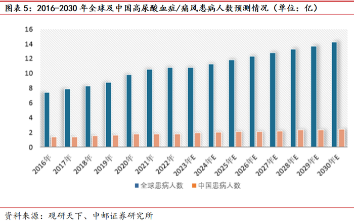 随着人们生活质量的持续上升,饮食结构与生活方式发生改变,高尿酸血症及痛风的患病人数也呈逐年上升趋势。据预测,2030年全球患者人数将达14.2亿人,预计我国高尿酸血症及痛风患病人数将达到2.4亿人。目前痛风无法完全治愈,对于急性发作期主要以控制症状、消除疼痛感为主,长期治疗主要以抑制尿酸生成、促进尿酸排出的方式来降低患者的尿酸水平。