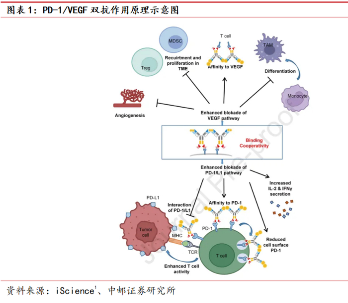 相较第一代PD-(L)1产品,PD-1/VEGF双抗中PD1协同了VEGF抗体或者VEGF trap阻断VEGF因子的能力,抗血管生成+调节免疫。免疫检查点(PD-1/PD-L1)通路和血管内皮生长因子(VEGF)通路之间存在内在的机制互补性。VEGF对血管生成、免疫细胞浸润以及树突状细胞成熟均有显著影响,这为将抗PD-1/PD-L1抗体与抗VEGF/VEGFR抗体联合用于癌症治疗提供了理论基础。