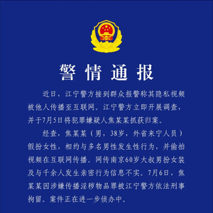 近日,江宁警方接到群众报警称其隐私视频被他人传播至互联网。江宁警方立即开展调查,并于7月5日将犯罪嫌疑人焦某某抓获归案。