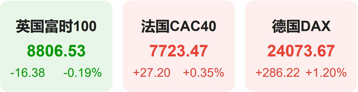 欧洲股市方面,英国富时100指数小幅下跌0.19%,报8807点。法国CAC40指数小幅上涨0.35%,报7723点。德国DAX指数上涨1.20%,报24074点。