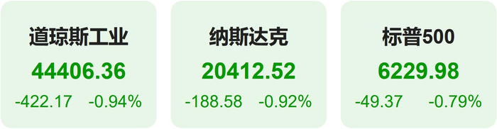 截至收盘,标普500指数跌0.79%,报6229.98点;道琼斯指数跌0.94%,报44406.36点;纳斯达克指数跌0.92%,报20412.52点。