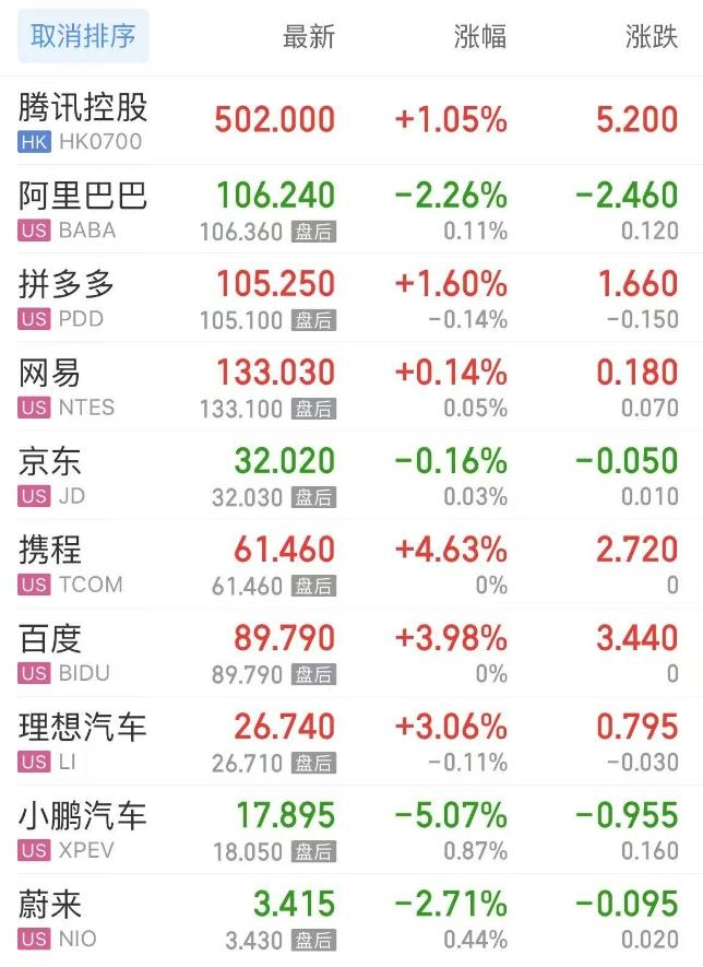 热门中概股方面,腾讯控股(港股)涨1.05%,阿里巴巴跌2.26%,拼多多涨1.60%,网易涨0.14%,携程涨4.63%,百度涨3.98%,理想汽车涨3.06%,小鹏汽车跌5.07%,蔚来跌2.71%。