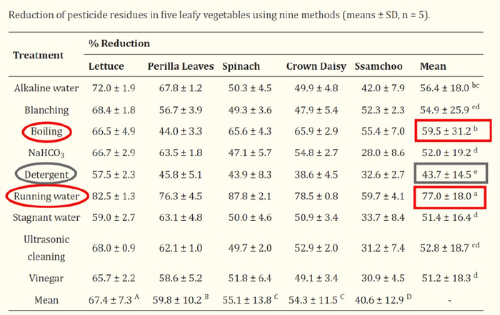 [8]Yang SJ, Mun S, Kim HJ, Han SJ, Kim DW, Cho BS, Kim AG, Park DW. Effectiveness of Different Washing Strategies on Pesticide Residue Removal: The First Comparative Study on Leafy Vegetables. Foods. 2022 Sep 19;11(18):2916. doi: 10.3390/foods11182916. PMID: 36141043; PMCID: PMC9498324.