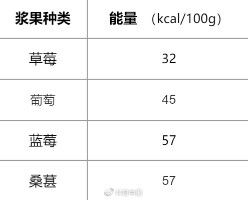 大部分浆果每 100g 有 40~60kcal,在水果中的热量排名中等偏下。