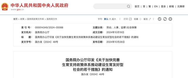 2024年10月,国务院印发《关于加快完善生育支持政策体系推动建设生于友好型社会的若干措施》的通知。
