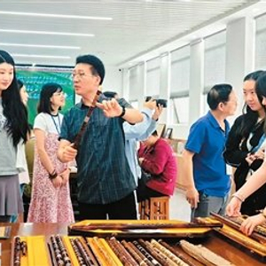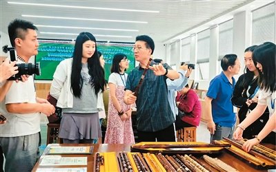 在玉屏箫笛工匠坊,学校教师王展才向大家介绍乐器。