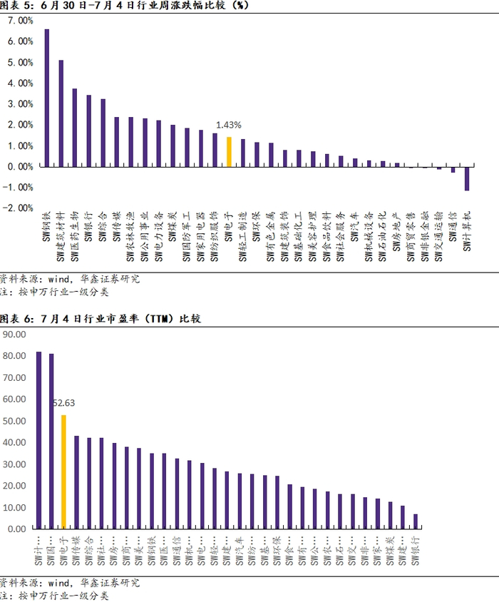 6月30日- 7月4日当周,申万一级行业整体处于涨跌分化态势。其中电子行业上涨1.43%,位列第14位。估值前三的行业为计算机、国防军工、电子,电子行业市盈率为52.63。