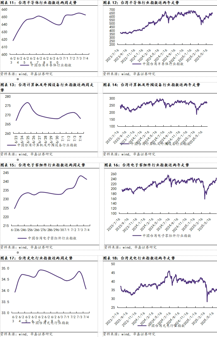 近两周:环比看,6月23日-7月4日两周,台湾半导体行业指数、台湾电子零组件行业指数均呈现震荡上行态势。台湾计算机及外围设备行业指数和台湾光电行业指数呈现小幅震荡下行态势。
