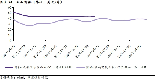 面板价格保持稳定态势。面板价格自2021年7月以来,价格持续下降,目前价格整体保持稳定,其中液晶电视面板:32寸:OpenCell:HD价格近期略有回升,2025年6月23日为38美元/片,液晶显示器面板:21.5寸:LED:FHD价格自2022年8月23日以来,价格逐步由44.3美元/片下降至43美元/片,2024年3月22日价格略有上升,为44美元/片。