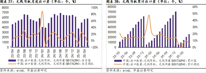 无线耳机方面,国内海关出口数据显示,2023 年以来呈现复苏趋势,2024年全年无线耳机月度出口量同比增幅大部分时间为正,累计出口量同比稳定增长。无线耳机技术已经充分成熟,相对于手机消费,无线耳机普及还有空间,随着无线耳机传感器的增多,产品体验感会更加出色,叠加价值量相对手机较小,换机周期会显著快于手机。因此,随着国内的放开和经济复苏,我们继续看好无线耳机这类可穿戴设备的成长。