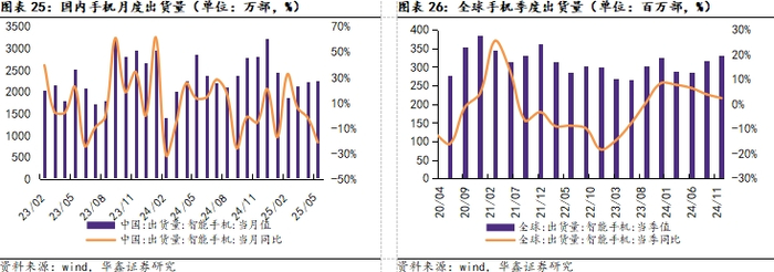 2025年5月国内手机出货量同比下降21.2%。全球范围内,2024年全球智能手机出货量同比增长5.04%,分季度来看,四个季度手机出货量均维持上升。2024年全球手机出货量逐渐回暖,主要由于两个方面,一方面是全球进入新一轮换机周期;另一方面是折叠机、AI手机等新产品不断发布。