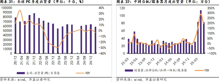 个人电脑方面,2025年第一季度,全球PC出货量同比下滑2.88%。2025年5月,国内品牌台机出货量达到82.58万台,同比增长195.64%。回顾历史,2020-2021年疫情带来居家办公需求快速上升,推动PC重回增长轨道,但疫情带来的短期复苏结束后PC重回弱势趋势,在2022Q2开始进入下行区间,2023Q3开始出货量同比降幅逐步收窄,全年品牌台机/品牌一体机/服务器出货量同比微增2.62%。AI大模型落地给PC产业链带来新的创新驱动力,另外PC换机潮的到来,2025年PC市场有望恢复增长。
