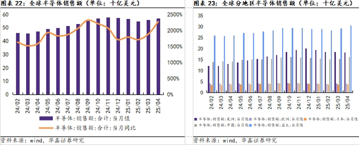 全球半导体销售额自2024年4月份触底以来逐步攀升。2025年4月,全球半导体当月销售额为569.6亿美元,同比增长22.70%,环比增长1.90%,其中中国销售额为 162亿美元,环比增长5.13%,占比达 28.44%。自2024年2月以来,全球半导体销售额同比连续保持正增长,半导体行业景气度提升显著。