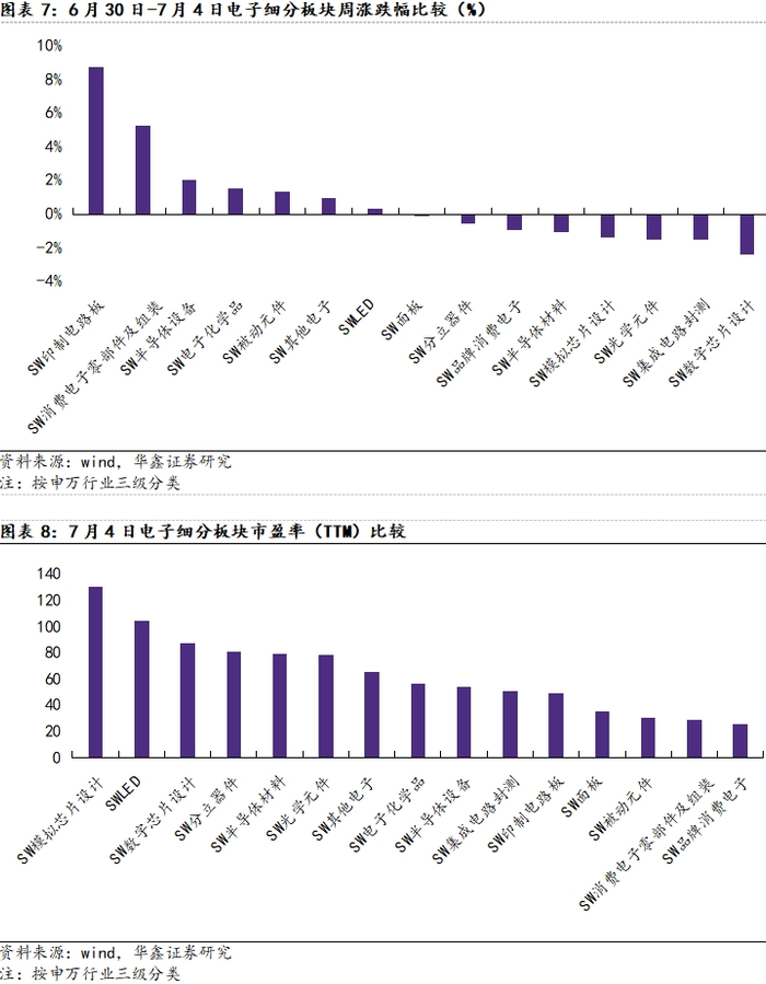 电子行业细分板块比较,6月30日-7月4日当周,电子行业细分板块涨跌呈分化态势。其中,印制电路板板块涨幅最大,达到8.79%。估值方面,模拟芯片设计、LED、数字芯片设计板块估值水平位列前三,分立器件和半导体材料板块估值排名本周第四、五位。