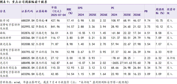 6月30日-7月4日当周,重点关注公司周涨幅前十:消费电子零部件及组装占三席、激光设备占两席,其他专用设备、光芯片、磁性材料、面板和数字IC各占一席。思特威-W(数字IC)、华勤技术(消费电子零部件及组装)、沃格光电(面板)包揽前三,周涨幅分别为10.75%、10.12%、8.58%。