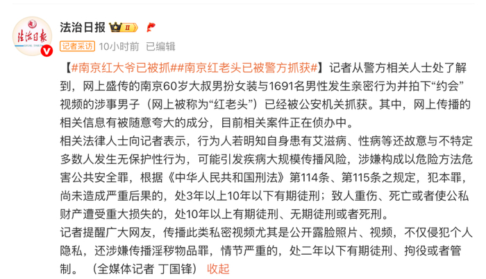 据法治日报此前消息,网上盛传的南京60岁大叔男扮女装与1691名男性发生亲密行为并拍下“约会”视频的涉事男子(网上被称为“红老头”)已经被公安机关抓获。其中,网上传播的相关信息有被随意夸大的成分,目前相关案件正在侦办中。