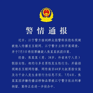 近日,江宁警方接到群众报警称其隐私视频被他人传播至互联网。江宁警方立即开展调查:并于7月5日将犯罪嫌疑人焦某某抓获归案。