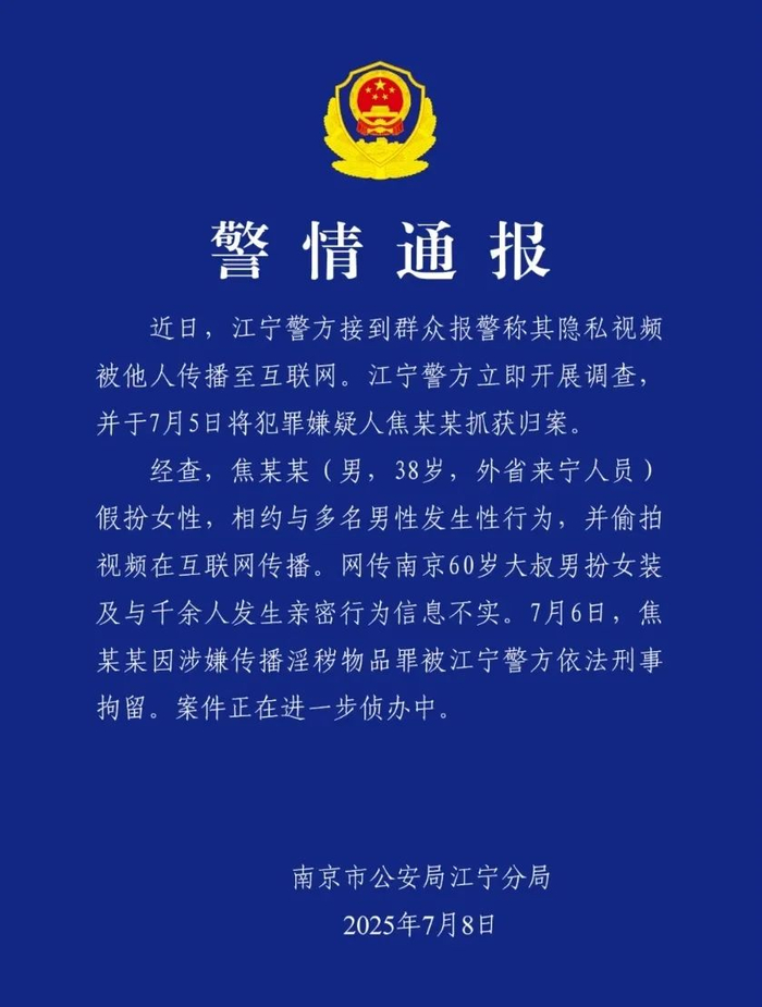 7月8日,南京市公安局江宁分局发布通报: