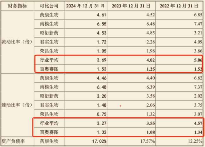 与融资动作相伴的是公司持续攀升的债务压力,资产负债率从2022年的58.9%一路升至2024年的65.28%,无论是资产负债率还是流动比率、速动比率指标均低于同行可比公司均值。