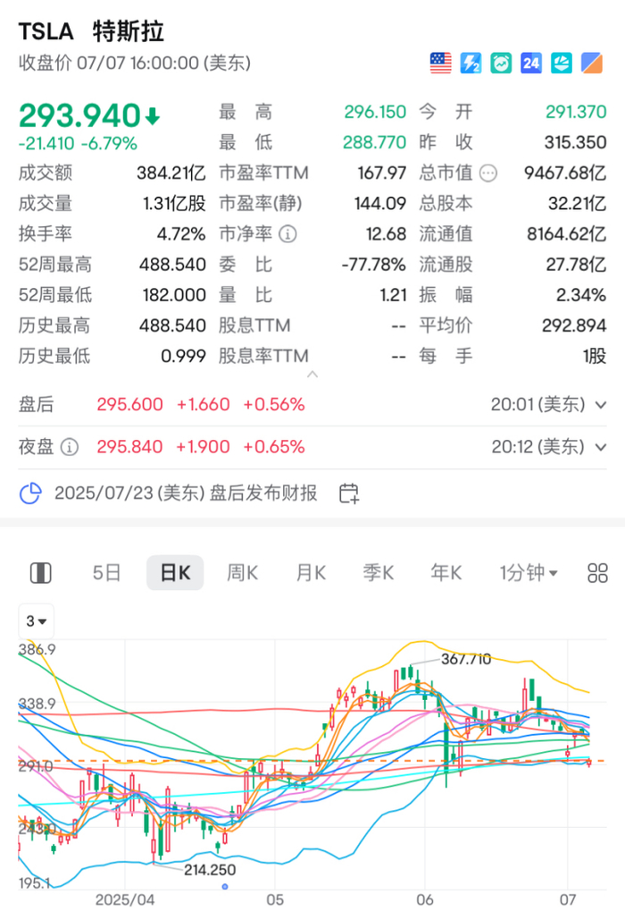 此外,马斯克宣布成立“美国党”引发市场担忧。特斯拉跌6.79%,公司总市值损失超680亿美元。
