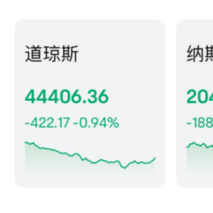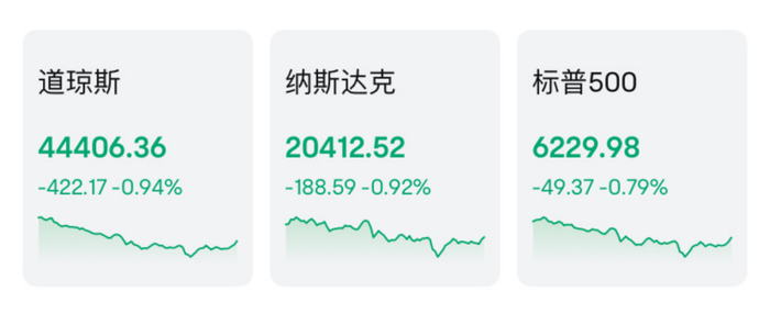 当地时间周一,美股全线下跌,道指跌0.94%报44406.36点,标普500指数跌0.79%报6229.98点,纳指跌0.92%报20412.52点。