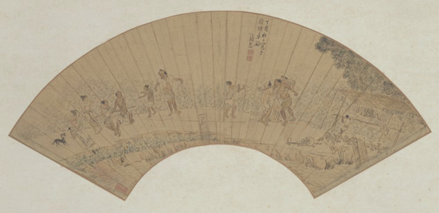 明代张宏《农夫打架》扇页,故宫博物院藏。
