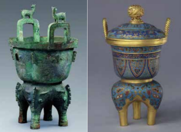 左图为商代兽面纹鹿耳四足青铜甗(yǎn,先秦时期的蒸食器具),江西省博物馆藏。右图为乾隆款掐丝珐琅兽面纹甗,故宫博物院藏。