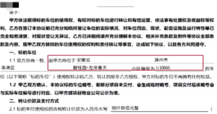 另一为投资者表示:通过上海的这家财务咨询公司,她了解到总共有千屹、以游、票融通和金交所四个平台可以投资,她就投资了其中千屹和票融通两个平台。千屹平台是通过售卖车位来进行获利的。曲女士向记者提供了《车位使用权转让协议》,上面显示她总共投资了6.3万元,购买了位于安徽滁州和湖南衡阳两个城市的车位。