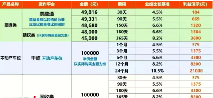 理财师介绍:“所以它不是三个月的车位,六个月车位,一年的车位。这个概念是委托三个月、六个月、一年代销。这样清楚了吗?清楚。所以呢我们我们讲其实很简单,为什么我说一分钟?一分钟是绝对可以讲明白的。简单说就是集团批发车位过来,从大开发商那边对吧?因为我们一次性付款,一次就拿他1000个、2000个,或者整个车位项目几千个车位全部都包了。那我们就能用很低的价钱,三折、4折就能拿过来。拿过来之后呢,当地会有一个团队负责把这个车位卖给谁啊?业主卖给业主,谁住这小区,谁买这小区的房子,他一定是需要车位的。是不是?我们就把这车位卖给业主,用什么价钱卖给业主啊?市场价市场价10万的车位,我们可能三四万拿的,我照样卖十万给业主,对吧?但是我们车位1000 2300千5800千个车位也不可能一次都卖光。所以我在卖这个车位的过程当中就开放开放什么?线上开放线上投资。我把车位挂在APP上,你来投,你投30万,他投50万,反正你钱放在银行也没什么利息。现在利息这么低,对吧?没什么好的投资渠道,那你就过来投,我们帮你代销卖掉对吧?卖掉了,那你就在这个过程当中提前拿到收益。没卖掉到期我付你违约金。这个违约金是多少?远超银行同期存款利息的就齐了,明白了吧?嗯,不用讲那么复杂。”
