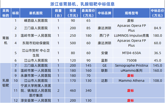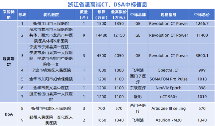 2023年6月23日-24日,浙江省卫生健康委员会正式公布了新一批影像设备集中采购的中标结果,总预算约5.1亿,涵盖了12套256排超高端CT设备、17套超高端CT、3套DSA、6套胃肠机设备以及7套乳腺钼靶设备。