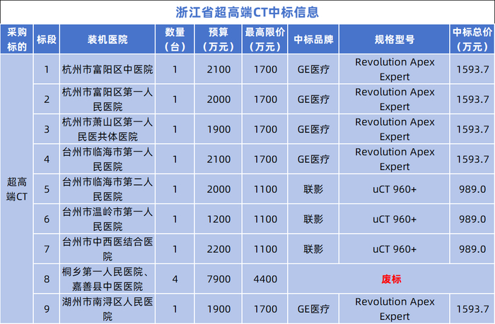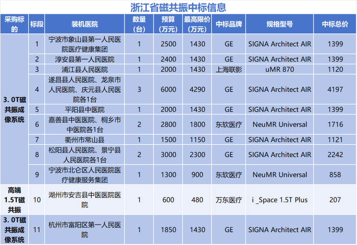 从目前来看,浙江省这四批次设备集采总预算就高达7.7亿元。其中,GE医疗直接拿下18套超高端CT和10台3.0T磁共振,中标总金额已超3.7亿,是本次浙江省设备集采当之无愧的大赢家。