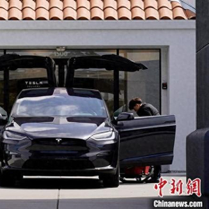 当地时间4月15日,美国加州圣马特奥县一家特斯拉电动车销售店的工作人员清洁一辆特斯拉电动车。 中新社记者 刘关关 摄