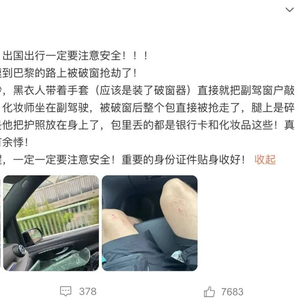 7月7日,歌手戴燕妮在社交媒体发文称,在机场高速到巴黎的路上遭遇破窗抢劫,“整个作案过程就几秒,黑衣人戴着手套(应该是装了破窗器)直接就把副驾窗户敲碎”,坐在副驾驶的化妆师包被抢走,腿部被碎玻璃划伤,她表示经历这一切,心有余悸!同时她也提醒网友出国出行注意安全,贴身收好重要身份证件。