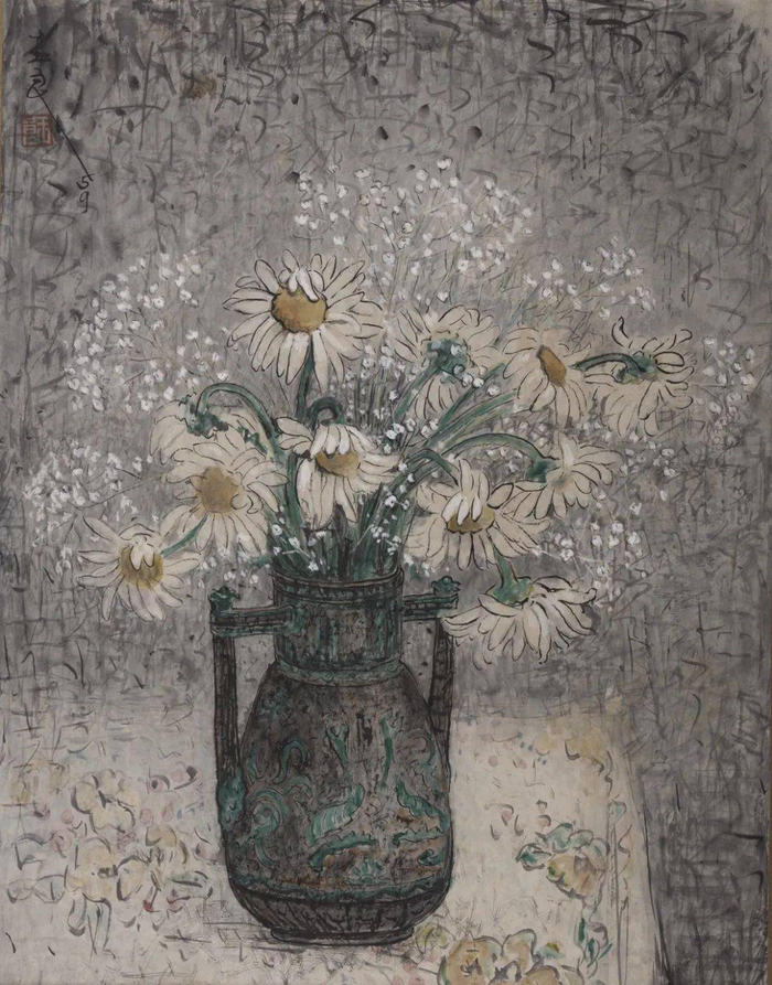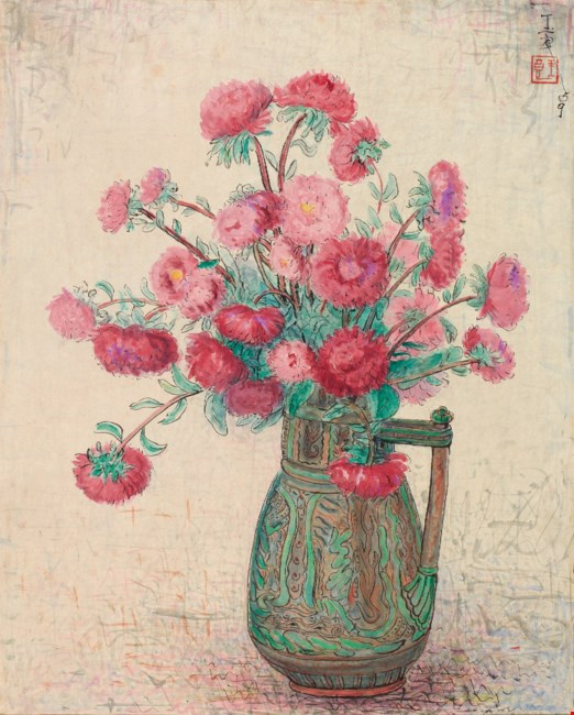 潘玉良的《瓶花》是其静物画中的经典之作,创作于 1959 年,此时她已在法国生活多年,但内心始终怀着对祖国的思念之情。这种情感也融入到了她的作品之中,通过对瓶花等题材的描绘,寄托自己的乡愁。2014年11月22日,成交价5,440,000港元。