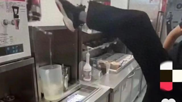 7月7日,一名自称在蜜雪冰城打过工的网友发布的视频显示,一名男子在操作间内用脚踢向直饮水桶水龙头尝试关闭。