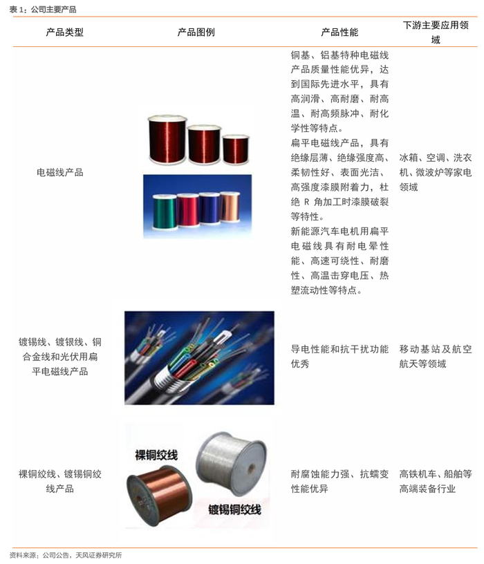 公司产品种类丰富,主要产品分为三大系列。一是漆包圆铜线、漆包扁铜线系列产品,工厂分别位于安徽铜陵、广东和天津,均为公司与美国里亚合资工厂;二是漆包圆铝线系列产品,工厂分别位于安徽铜陵和广东,其中广东工厂为公司与美国里亚合资工厂;三是特种导体(镀锡线、镀银线、镀镍线、绞线、并线等)系列产品工厂分别位于安徽铜陵、江苏常州和常熟、广东东莞。公司特种电磁线广泛运用于家用电器、汽车电机,包括新能源汽车电机、工业电机、变压器、电动工具、微特电机、电子、通讯、交通、电网等领域,满足国内外不同客户的需求;特种导体则广泛用于汽车线、电子线、特种缆、风能、船舶、通讯、军工、航天航空等领域。