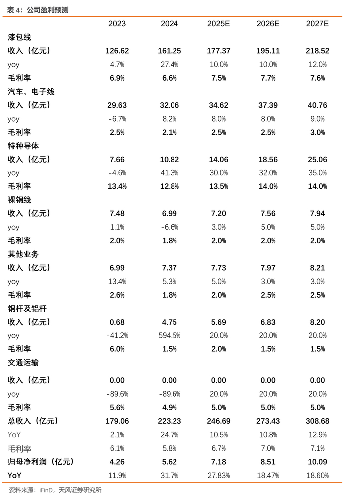 漆包线:1)公司为电磁线制造领军企业,产销规模领先国内同行,漆包线业务具有稳固的市场地位。2)扁线电机渗透率有望提升,叠加铝代铜趋势明显,利好公司漆包线业务。我们预计随着公司漆包线销量进一步放量,25-27年漆包线营收有望实现10%左右的增长。预计25-27年漆包线实现营收177.37/195.11/218.52亿元,同比+10%/+10%/+12%,毛利率为7.5%/7.7%/7.6%。
